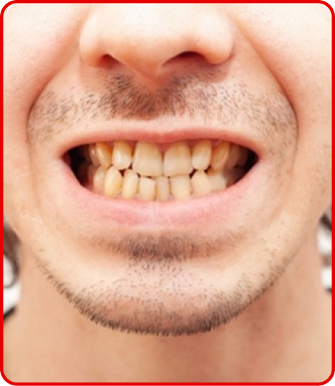 Zęby o żółtawym zabarwieniu, z przebarwieniami.